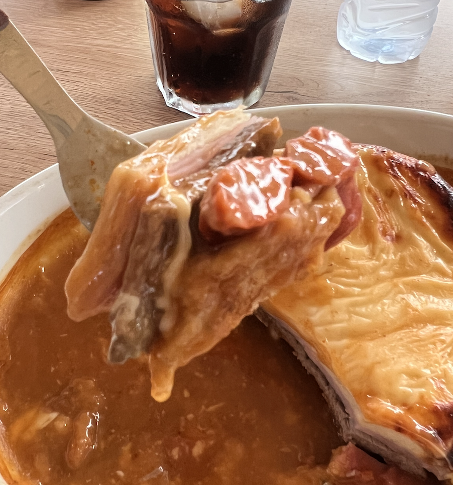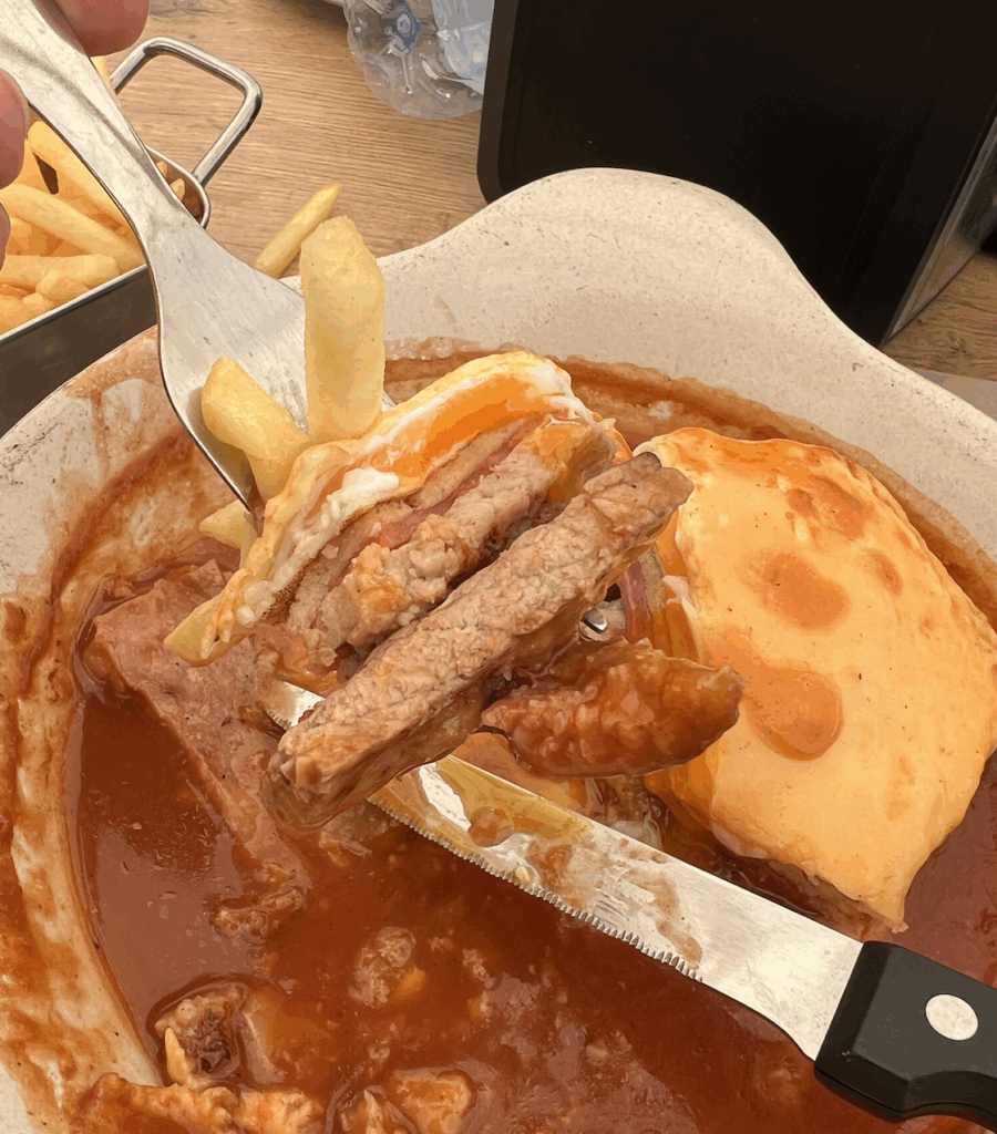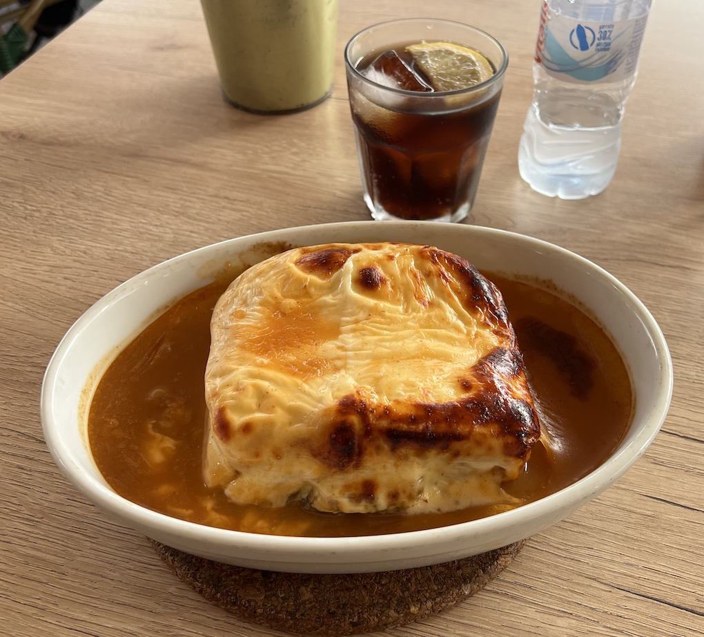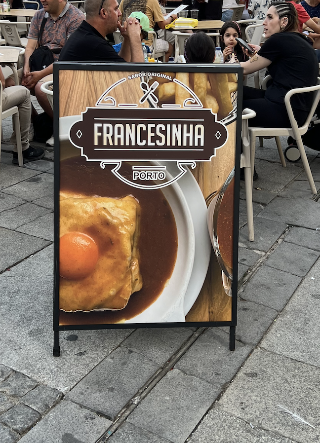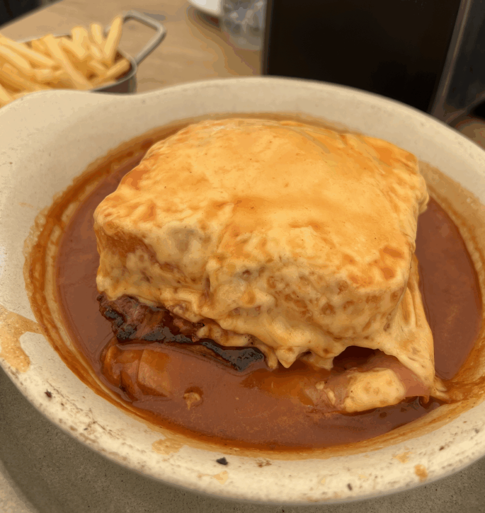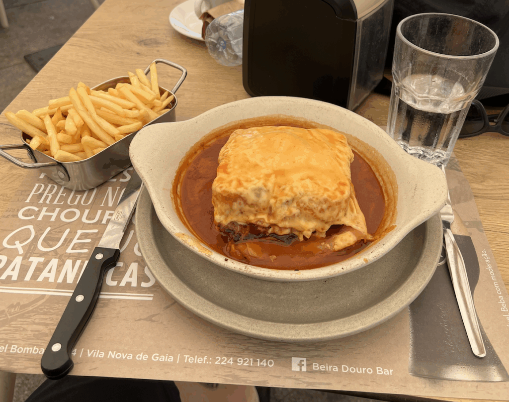 I sat at one of the restaurants by the river and tried a signature dish from Porto called Francesinha. A francesinha is a hearty layered Portuguese sandwich featuring various meats like steak, ham, and sausages, topped with melted cheese and a spicy, thick tomato and beer sauce. Traditionally, it is served with french fries and a fried egg on top.